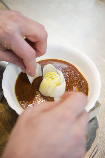 Zet als eerste de suiker met het water op in een pan op matig vuur. Zodra het geheel kookt zal het water verdampen waardoor de suiker vanzelf gaat karameliseren. Zodra de suiker een mooie donkere kleur heeft giet je dit direct, gelijkmatig in een porseleinen cocotte met een opstaande rand. Laat de karamel hier verder in afkoelen. Als de karamel afgekoeld is gaan we de witlof over de breedte in tweeën snijden en gaan we de witlofblaadjes vervolgens vanuit het midden van de cocotte verdelen naar de buitenkant, zodat er een mooie roos van witlof ontstaat. deze roos dek je vervolgens af met de ronde plak bladerdeeg. Plaats het geheel voor 30 minuten in de oven op 200 graden. Na 30 minuten de Tarte Tatin direct omdraaien d.m.v. een plat bord bovenop de cocotte te leggen en het geheel in een vloeiende beweging om te draaien. Vervolgens bedekken we de warme Tarte Tatin met dunne plakken gesneden schapenkaaas zodat die licht kan smelten. Daarna raspen we de walnoten over het gerecht en als finishing touch de dunne plakjes romanesco die we aangemaakt hebben met de sherry-azijn.