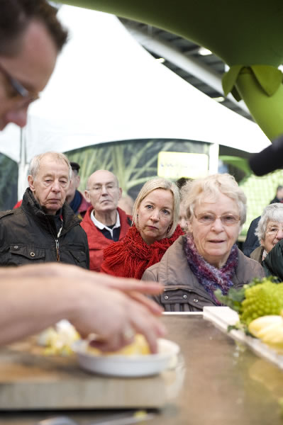 Vol aandacht keken de bezoekers van het Holland Food & Flowers Festival naar de verrichtingen van sterrenkok Onno Kokmeijer. Deze keer ging aan de slag gaat met de witlof van Quality Growers Holland en romanesco van Westfresh. Teler Jan Ruiter van COR bv uit Oostwoud gaf uitleg over de teeltwijze. Vandaag de dag wordt witlof geteeld op water. Hierdoor blijven de kroppen mooi schoon en kunt u ze nog sneller verwerken in uw gerechten. Meer informatie en recepten zijn te vinden op de sites: qualitygrowersholland.nl en westfresh.nl