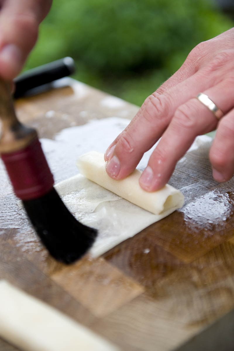 Snijd de brickdeeg vel in tweeën en snijd de zijkant bij. Leg de Edammer kaas op het breedste gedeelte en smeer met behulp van een kwast de zijkanten van het brickdeeg in met eiwit. Vouw de zijkanten over de kaas en rol vervolgens het geheel strak op. Zorg dat je een mooie strak gevouwen loempia krijgt.