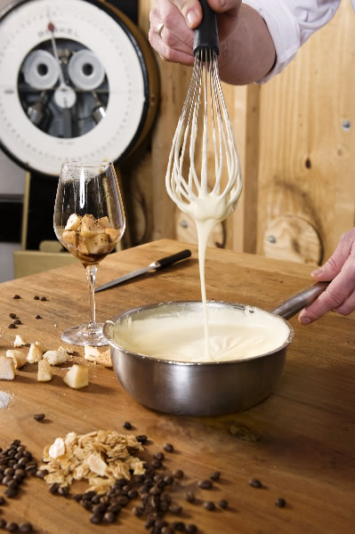 Breng de koffie met de suiker en de Kahlúa aan de kook. Schil in de tussentijd de peer en snijd deze in 8 partjes en verwijder het klokhuis. Haal de kokende pan met koffie van de warmtebron en voeg de partjes peer toe en laat deze daarin afkoelen. Doe vervolgens de amandelschaafsel in de oven om te bruineren op 160 graden. Voor de sabayon brengen we de champagne met de suiker en de vanille aan de kook, laat het vocht afkoelen tot 70 graden en voeg dan de eierdooiers toe. Plaats de pan terug op de warmtebron en sla m.b.v. een garde de massa tot een luchtige, lobbige sabayon. Belangrijk hierbij is dat het geheel 80 graden wordt om het gewenste resultaat te krijgen. Voor de opmaak pakken we een wijnglas en verdelen daar de in grove stukken gesneden bitterkoekjes in, daarop leggen we de in stukken gesneden peer. Vervolgens besprenkelen we het geheel met wat pocheervocht. Voor de ‘crunch’ pletten we met de platte kant van een koksmes de koffiebonen en strooien dit in het glas op de peer. Als laatste gieten we de warme sabayon van vanille op de peer en bitterkoekjes. Als finishing touch doen we de gebruinde amandelschaafsel en nog wat koffie crunch op de sabayon.