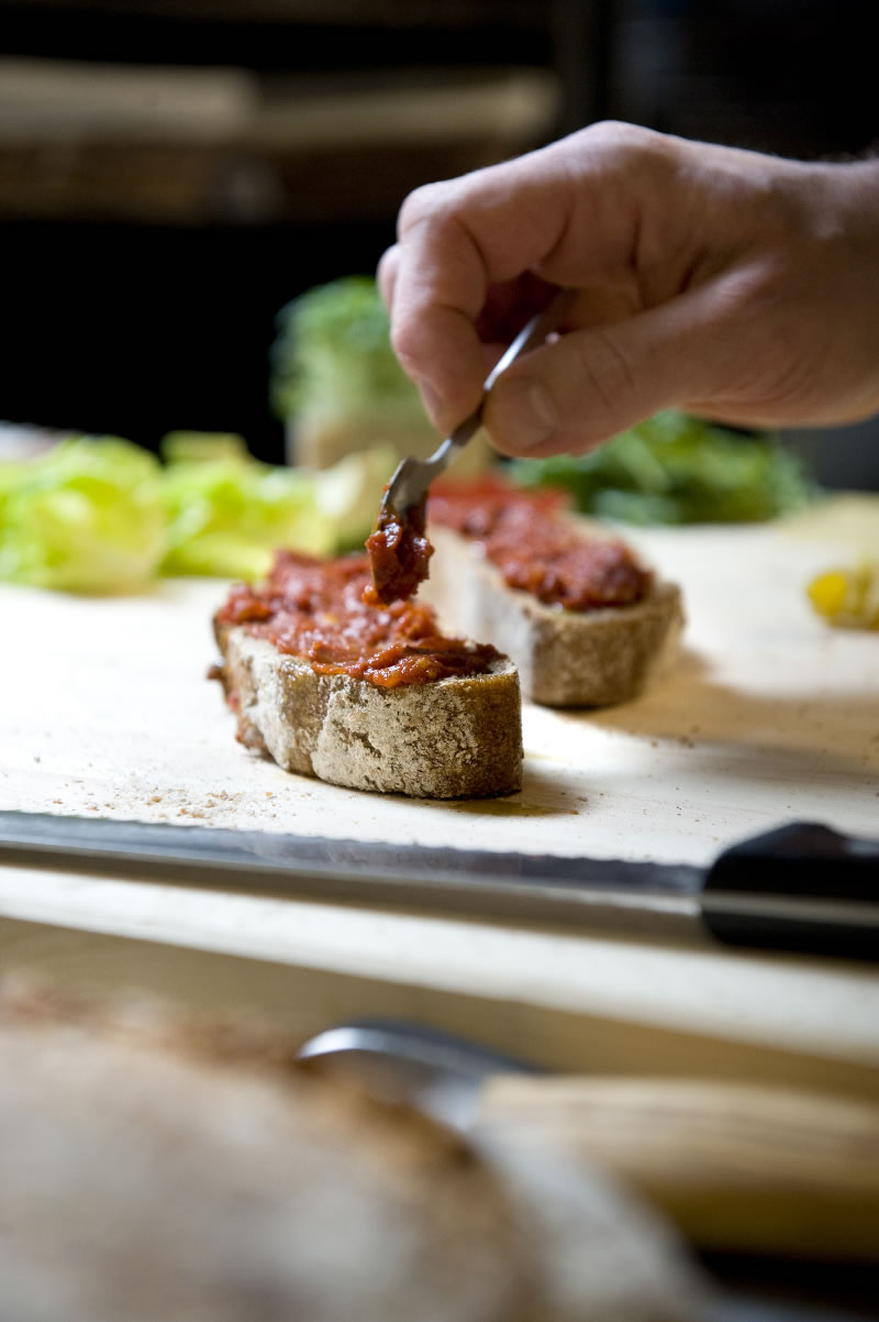 Voor de chutney de bovenkant van de tomaat insnijden en voor 20 sec even in kokend water dompelen, vervolgens direct koud spoelen. Velletje verwijderen van de tomaat en vervolgens in vieren snijden en de zaadlijst verwijderen. Daarna de tomaat in grove blokjes snijden. Verhit op matig vuur de olijfolie in een pan en zet zonder kleur de uien en de knoflook aan in ruim olijfolie. Voeg vervolgens de blokjes tomaat door en laat het geheel op zacht vuur rustig door sudderen net zolang tot de juiste dikte is bereikt, breng op smaak met peper en zout. Voor de maaltijd sandwich snijdt u vier gelijkmatige plakken van ongeveer 2 cm dik van het speltbrood. Ruim besprenkelen met olijfolie en evt. toasten in de oven. Vervolgens de plakken insmeren met de tomaatchutney. Meng de mayonaise met de savory mosterd tot een gladde massa en spuit m.b.v. een spuitzak op de plakken brood. Dan de mini kropsla over de plakken brood verdelen tezamen met de geroosterde paprika. De eieren los tikken met een garde en op smaak brengen met peper en zout. Bak de ei op matig vuur heel dun als een flensje zonder kleur. Nadat het omeletflensje uit de pan komt direct oprollen als een pannenkoekje en laten afkoelen. Daarna rondjes van 1 cm dik snijden en verdelen over de plakken speltbrood. De Cheddar kaas of oude Klaverkaas over de plakken speltbrood kruimelen. Als laatste de pompoenpitten met de notensla en de tuinkers over de plakken speltbrood verdelen (speels). En als finishing touch besprenkelen met olijfolie.