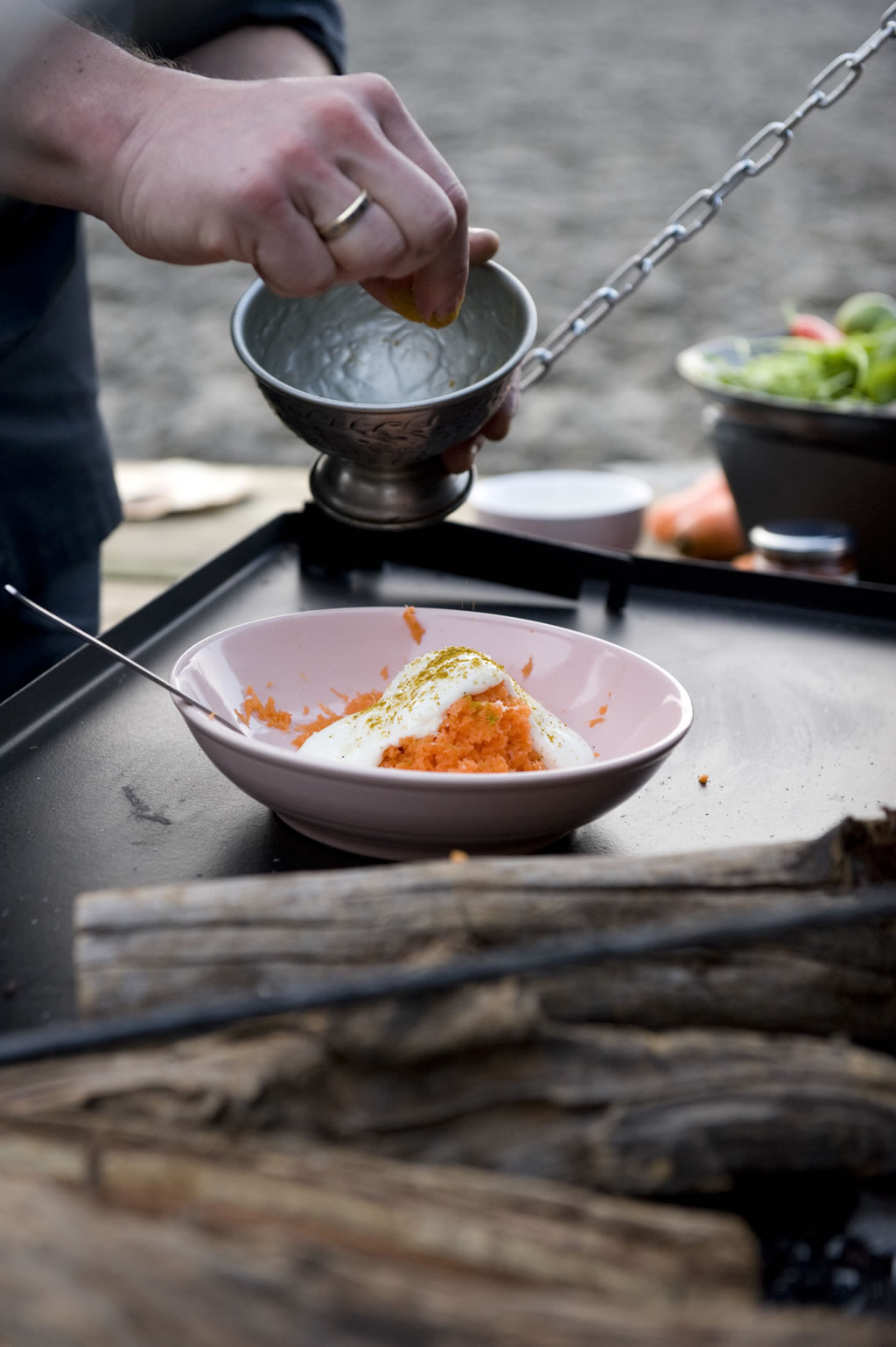 Rasp de wortel over een fijne rasp en meng met de boerenyoghurt. Vervolgens knoflookketchup, Ras el Hanout en zout toevoegen. Als laatste de fijngesneden munt toevoegen.